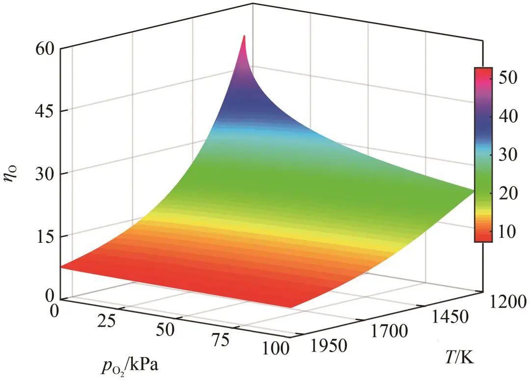 由圖7可知,當溫度低於1500 K時,ΓO,Ag隨氧氣壓力升高顯著增加;當溫度高於1500 K時,由於液態Ag-O係中的氧溶解度顯著降低,ΓO,Ag隨氧氣壓力的增加,其增加幅度減小。觀察圖8可知,η隨著溫度和氧分壓的升高而呈現下降趨勢。這是因為式(27)中的表麵偏析平衡係數KII與溫度呈負相關,當溫度升高時KII減小,導致表麵氧濃度降低。此外,在較低的氧分壓條件下,O原子傾向富集於表麵;當氧分壓升高時,更多的O原子溶入液態Ag-O係中,引起η減小。