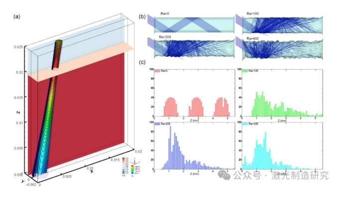 圖1(A)中顯示了計算領域的圖形說明。計算域的大小設置為20 mm×2 mm×25 mm。計算域劃分為1.25億個邊長為0.02 mm的六麵體網格。在初始狀態下,將厚度為20 mm的下部設置為工件層(階段2),將厚度為5 mm的上部設置為環境空氣層(階段1)。前壁(Y=0)被設置為對稱邊界條件,頂麵(Z=25 mm)被設置為壓力輸出邊界條件,其他表麵被定義為壁邊界條件。使用了Ansys-FLUENT®軟件用於模擬。采用C語言編寫的用戶自定義函數(UDF)實現光線跟蹤過程。圖1(B)顯示了光線追蹤過程的驗證案例,在該案例中,一束平行光束被射入具有不同表麵粗糙度的方腔。圖1(C)表明,在高Ra條件下,隨著表麵粗糙度的變化,能量分布明顯改變,更多的能量集中在第一反射區。表3列出了模擬中使用的物理特性。