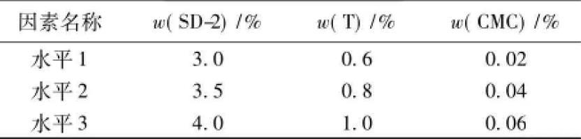 乳化劑SD-2,締合型增稠劑T和羧甲基纖維鈉等是CA砂漿陰離子乳化瀝青中最關鍵的3種組分,對乳化瀝青的性能起著決定性的影響。為了比較對油水界麵張力和乳化瀝青貯存穩定性的影響,采用L9(34)正交試驗的方法進行優化設計,因素水平見表1。