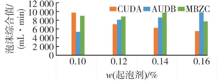 由圖2可知:隨著起泡劑用量的增加,CUDA型起泡劑的泡沫綜合指數逐漸下降;AUDB型起泡劑的泡沫綜合指數逐漸升高,且在質量分數達到0.16%時達到峰值9 762 mL·min;而MBZC型起泡劑的泡沫綜合指數先上升後下降。由此可見,AUDB型起泡劑的泡沫強度最高。