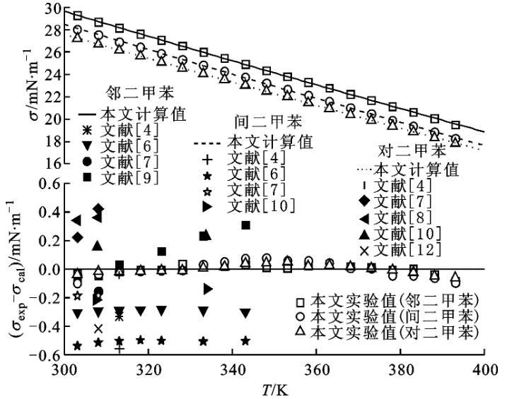 圖4鄰二甲苯、間二甲苯和對二甲苯表麵張力與溫度關係以及與方程計算值和文獻值比較