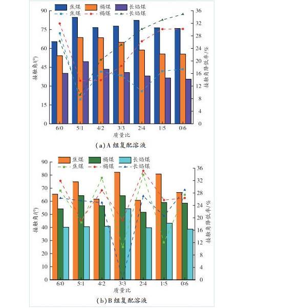 1)與純水相比,複配後的A、B 2組溶液的接觸角明顯降低,對於焦煤、褐煤、長焰煤,B組溶液複配質量比為2∶4時接觸角降低最多,分別為31.131%,27.969%、14.713%;對於焦煤,A組溶液複配質量比為6∶0時接觸角降低最多,為26.452%,對於褐煤、長焰煤,A組溶液複配質量比為1∶5時接觸角降低最多,為25.982%、20.026%。