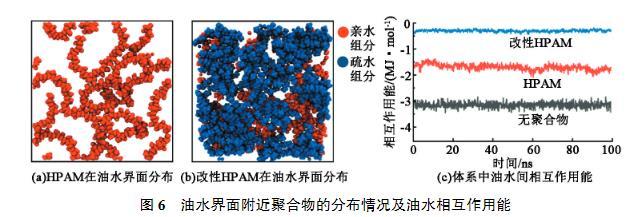 界麵張力來自於界麵處分子受到的應力不均衡,因此需要增加兩相之間的聯係,從而減少界麵張力。由於HPAM分子本身親水,與水相具有較強的相互作用,因此主要考察HPAM和油相之間的相互作用強度。圖5(a)為HPAM和改性HPAM與油相的相互作用能隨時間的變化。可以看出,HPAM在0~100 ns的模擬過程中相互作用強度逐漸降低,說明部分HPAM從油水界麵處脫離進入水相。由圖5(b)也看出HPAM分子大量均勻分布在水相中,其主要原因也是缺少親油基團,不易在界麵處穩定存在,更傾向於溶解於水中。而引入疏水基團改性後的HPAM與油相的相互作用能明顯強於HPAM與油相的作用能。由圖5(c)看出改性HPAM大多數分布在油水界麵附近。改性HPAM在界麵處橋接了油相與水相,緩解了界麵處分子應力不均衡,從而起到降低界麵張力的效果。
