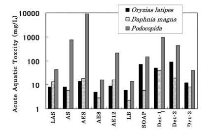 7 種表麵活性劑和 3 種商品化劑的急性毒性 使用 3 種測試生物測量清潔劑: oryzias latipes、daphnia magna 和 podocipida。 結果 如圖 1 所示。在所有情況下,EC50 和/或 LC50 podocopida 高於 oryzias latipes 和 daphnia magna。 SOAP 和 LB 的毒性值 oryzias latipes 高於 daphnia magna, 而其他 5 種表麵活性劑的毒性值 oryzias latipes 或 daphnia magna 幾乎相等。 這 表麵活性劑可分為三類; 低毒 組(AES、SOAP 和 AE12),中毒性組(LAS 和 AS) 和高毒組 (AE8 和 LB)。