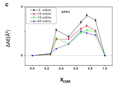 純和混合單層的 pA 等溫線與分子麵積的關係如圖 1 所示。CMR/DPPG 等溫線顯示出與純 DPPG 脂質相似的趨勢(圖 1a)。 相似相 對所有 CMR/DPPG 混合物都觀察到了轉變。 DPPG 和 DPPC 顯示崩潰壓力 (DPcoll) 為 52 mN.m-1 次方和 60 mN.m-1次方 , 分別。 一個過渡 (p ffi 3 mN.m-1次方 ) 從液體 發現純 DPPE 單層膨脹為凝聚相 與 D. coll 在 ffi55 mN.m-1次方 . 為 D. coll 獲得的值 純脂質與文獻一致(Vollhardt 等人, 2000; 諾沃塔斯卡等人,2014 年)。