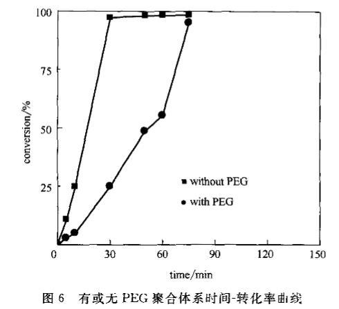 圖6有或無PEG聚合體係時間一轉化率曲線