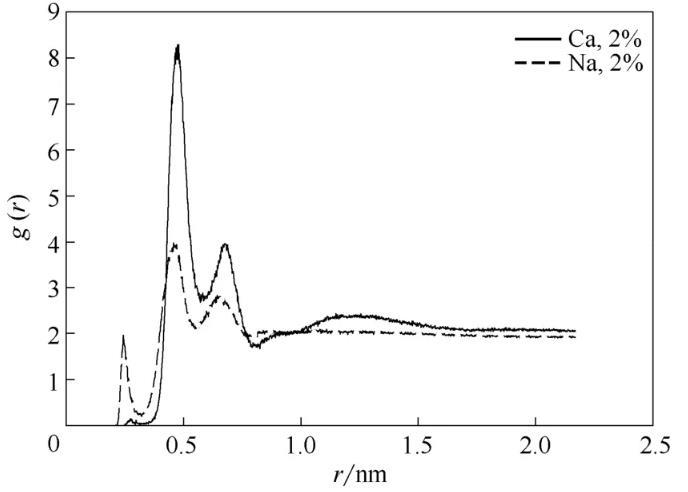 進一步分析OPES對Na+、Ca2+抗鹽性的差別,考察了磺酸基中的氧原子與Na+、Ca2+的徑向分布函數,如圖11所示。圖中兩曲線的峰值出現較大差距,其中Na+曲線的峰值明顯小於Ca2+曲線的峰值,這表明親水基團與Na+的作用較小,也就是說Na+對OPES的性質影響較小。因此,辛基酚聚氧乙烯醚磺酸鹽的抗鹽性順序為Na+>Ca2+,與對序參數所做的分析結論相同。