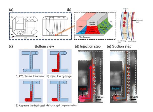 圖1展示了一個基於表麵張力的開放式微流體平台的結構和液體圖案化過程,用於再現肺部的三維細胞微環境。圖1a展示了微流體平台的頂視圖和側視圖。平台的中心區域包含微柱陣列,用於形成薄的水凝膠膜,兩側是包含不同細胞懸浮液的流體通道。圖1b展示了水凝膠和不同細胞層的位置安排,模擬肺部細胞環境的氣-液界麵結構。圖1c到圖1e展示了圖案化過程的兩個關鍵步驟——液體注入和保持。首先,水凝膠液體通過微柱流動;當液體達到通道的擴展區域時,使用吸取器將多餘液體移除,剩餘部分被保持在微柱之間形成所需的薄層。這一過程中利用了表麵張力的“毛細釘紮”現象,即通過幾何結構和表麵特性來控製液體的流動和停留。