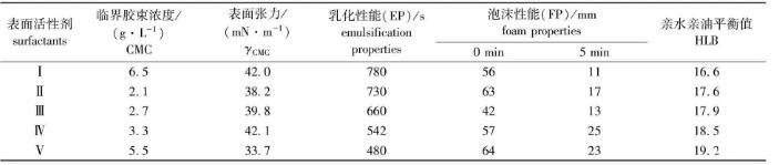 2.2.2 EP、FP和HLB值5種表麵活性劑的乳化性能、泡沫性能及親水親油平衡值如表2所示。