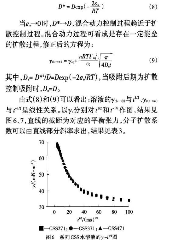 從表3可知,吸附初期GSS的擴散係數較吸附後期大2~3個數量級。表明GSS分子自本體溶液擴散到次表麵的速度遠大於在氣液界麵與次表麵之間的交換速度,因為在吸附初期(t→0),新鮮表麵不存在吸附勢壘,屬擴散控製吸附;吸附後期(t→∞),在氣液界麵吸附的GSS分子由於相互作用產生的位能壘、離子頭基間的靜電斥力以及分子的定位重排等共同作用導致了混合動力擴散控製。