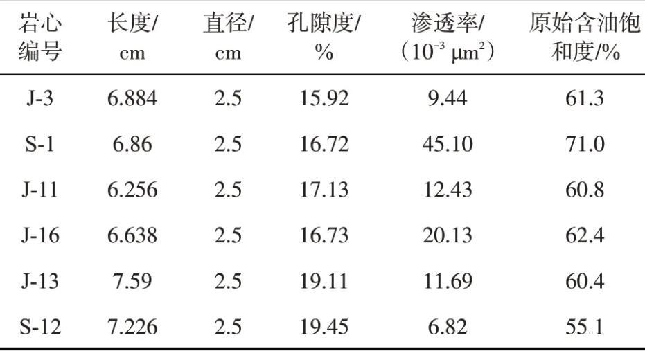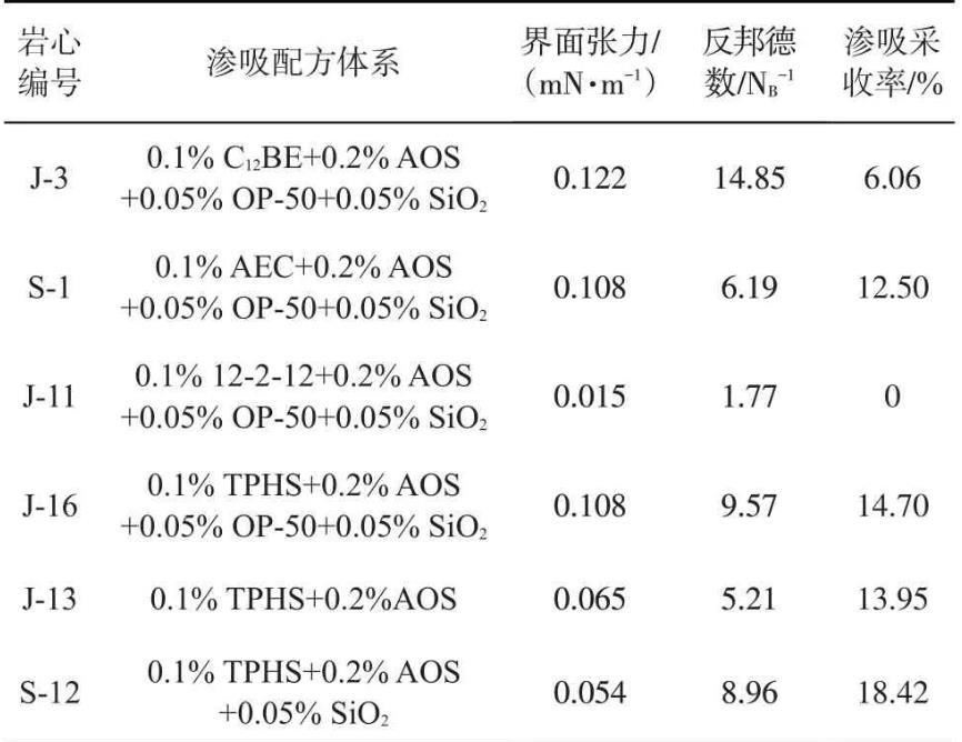 為驗證TPHS活性納米流體在滲吸采收率的應用,采用靜態滲吸實驗開展TPHS及常見表麵活性劑複配溶液滲吸效果對比研究,岩心的基本物性參數見表2,不同體係與原油間的界麵張力、所計算的反邦德數和滲吸采收率結果見表3,結果表明在滲吸過程中毛管力起主導作用。