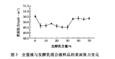 圖3全蛋液與發酵乳混合液樣品的表麵張力變化