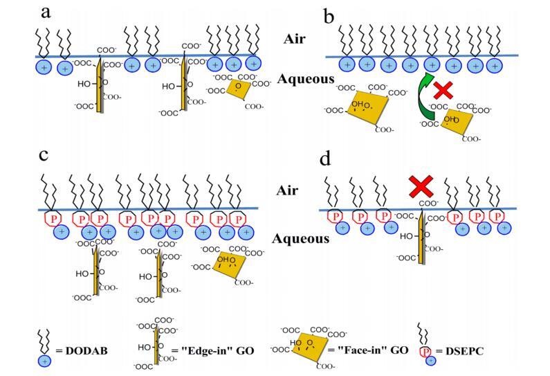 圖 3. GO 並入 DODAB (a, b) 和 DSEPC (c, d) 單層時可能取向的示意圖 氣水界麵。