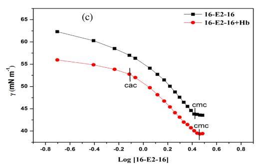圖 1. 16-E2-16/Hb 在不同溫度下的表麵張力。 (a) 298.15K (b) 308.15K (c) 318.15K。 [Hb] = 5 μM。
