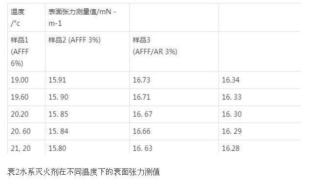 溫度條件對於液體表麵張力存在著很大的影響。大量試驗數據表明,液體的表麵張力會隨著溫度的升高而降低。通過對一係列流體滅火劑產品,包括不同配比的泡沫滅火劑(成膜型)、水係滅火劑等樣品進行測試,可以清晰地從表1、表2中看出,溫度的變化對流體型滅火剤的表麵張力存在一定程度的影響。