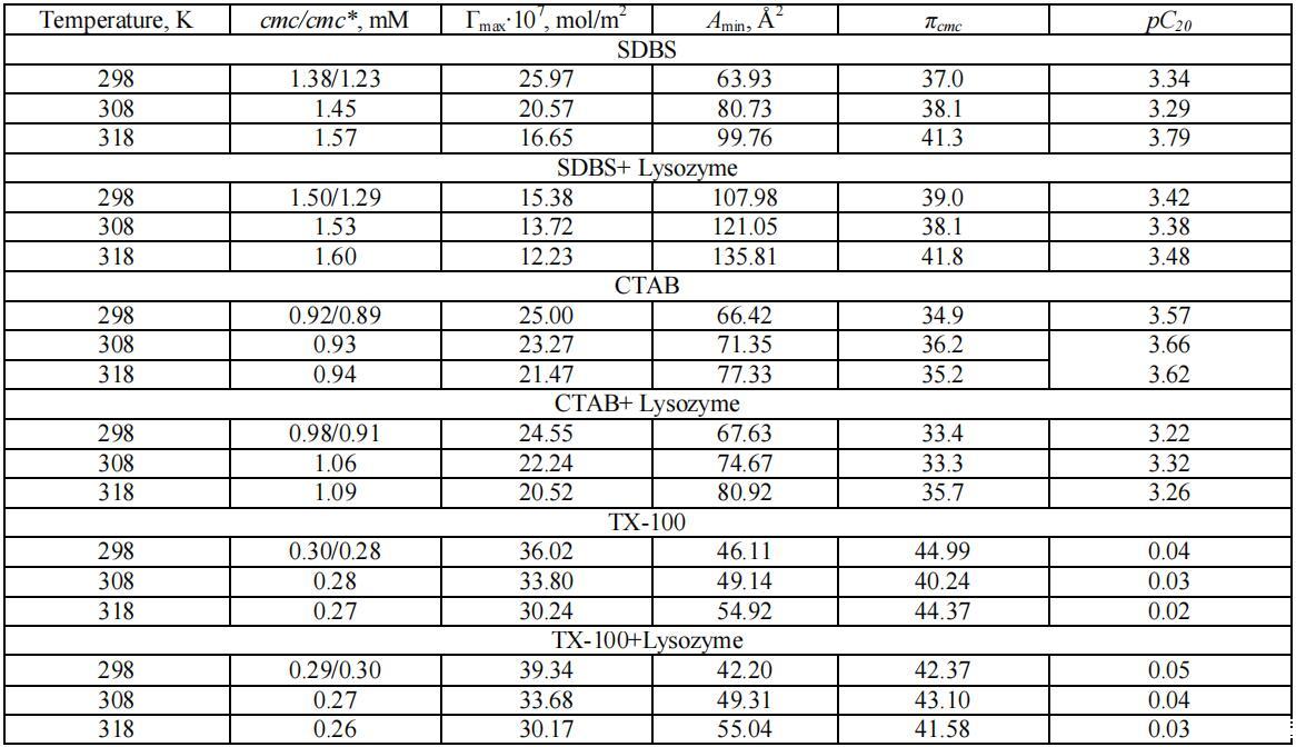在溶菌酶存在和不存在的情況下,不同種類表麵活性劑的物理化學和熱力學性質如下所述: