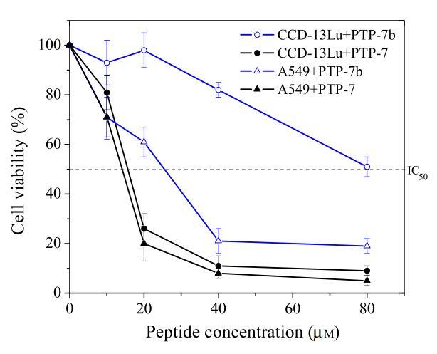 在細胞毒性研究中,選擇了研究充分的pH敏感裂解肽PTP-7b(FLGALFKALSHL)(6,9)。由於PTP-7b的過渡pH(pH=7.25)低於A549的表麵pH,但高於CCD-13Lu,因此裂解肽PTP-7b對A549的毒性可能比對CCD-13Lu細胞的毒性更大。選擇PTP-7b的親本肽PTP-7(FLGALFKALSKLL),一種pH不敏感的裂解肽(6,9)作為對照。如圖8所示,盡管肽PTP-7對兩種細胞的活性相同,但pH敏感肽PTP-7b對A549的毒性大約是對CCD-13Lu的三倍。