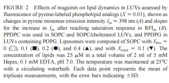 除上述相似性外,當使用芘標記的脂質類似物研究酸性磷脂對脂質動力學的影響時,兩種肽之間也存在明顯差異。Magainin 2導致兩性磷脂組成的LUV的芘發射顯著猝滅(圖2A)。然而,在PG存在的情況下,芘的單體強度增加,XPG逐漸增加了這種效應的幅度(圖2A)。圓二色性、拉曼光譜、傅裏葉變換紅外光譜和固態核磁共振研究表明,馬蓋寧在與脂質雙層結合時采用螺旋構象(Matsuzaki等人,1989年、1991年;Williams等人,1990年;Jackson等人,1992年;Bechinger等人,1993年;Wieprecht等人,1997年;Hirsh等人,1996年)。magainin 2對兩種膜的這些不同影響可能是由於1)通過與肽的帶正電基團(例如賴氨酸的?氨基)直接接觸使芘熒光猝滅,或2)插入雙層的=-螺旋肽改變熒光團的微環境,與層平麵平行,如上所述。然而,在PG存在的情況下,肽的正電荷應在與酸性磷脂形成靜電複合物時被中和,從而減少由於π-陽離子相互作用導致的芘熒光猝滅。