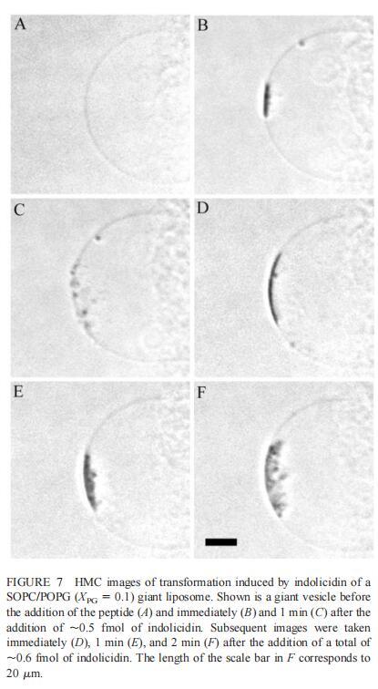 吲哚西丁隻含有13個氨基酸,因此太短,無法跨越雙層。然而,該肽可以作為聚集物或帶有相關酸性磷脂的頭尾二聚體橫跨雙層(圖9 E),從而導致膜不穩定性。已經證明,吲哚西丁能夠通過穿過外膜殺死革蘭氏陰性細菌,並通過形成通道破壞細胞質膜(Falla et al.,1996)。與magainin 2的作用相比,吲哚青黴素誘導的內吞小泡較小(圖7)可能反映了這些肽與脂質相互作用的不同模式。一些吲哚肽分子可能會轉移到膜的內部小葉中。除了具有廣譜的抗真菌和抗菌活性外,吲哚西丁對哺乳動物細胞也有毒性(Schluesener等人,1993年;Ahmad等人,1995年)。有趣的是,吲哚西丁對SOPC和SOPC膽固醇巨型脂質體的作用不同。在這一階段,根本原因尚不確定,可能與膽固醇對雙層結構以及吲哚肽在膜中的取向的影響有關。因此,需要進一步的研究來闡明膽固醇對吲哚肽膜結合的影響。