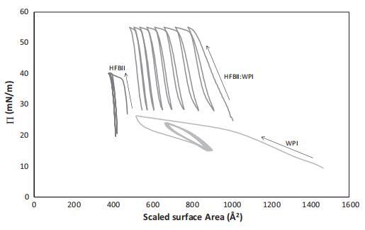 值得注意的是,對於純HFBII,П–A等溫線在連續的壓縮膨脹循環中不會發生變化,這再次表明HFBII不可撤銷地附著在界麵上,幾乎沒有任何構象變化。對於純WPI和1:1混合物,П–A等溫線略微向較小區域移動,這表明由於WPI分子的構象變化、多層形成或如前所述,由於WPI的解吸,表麵重排的可能性較小。
