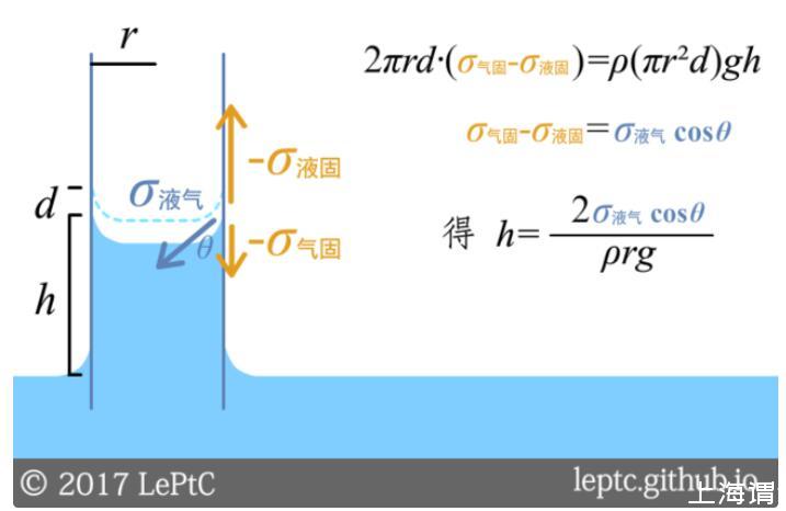 講到這裏,91视频网址软件已經有三種方法來解釋這個現象了:①水想增加自己跟玻璃管內壁的接觸麵積,直到表麵能的消耗不足以補償重力勢能;②固液接觸麵的負張力把液體向上拉;③凹液麵會降低液體內的壓強,從而外部氣壓把液體壓上來。三種方法都能推導出相同的結論,下圖中給出了第一種推法。