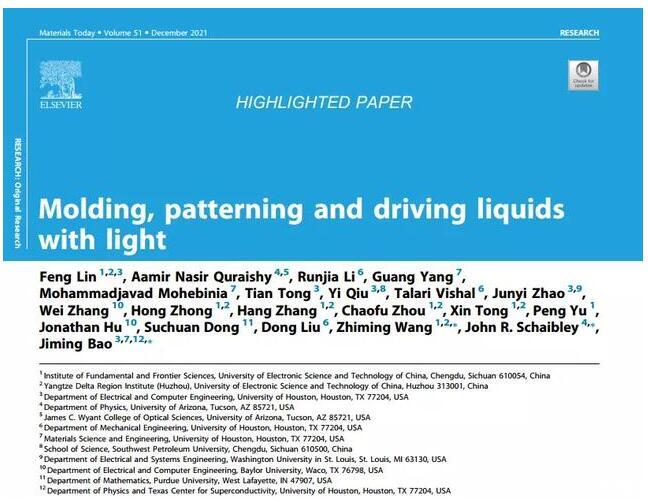 該論文以電子科技大學第一單位發表在國際頂級期刊Materials Today上,並被期刊主編選為Highlighted paper作為亮點工作報道,論文題為《光驅動液體塑模、繪畫和運動》(Molding,patterning and driving liquids with light)[1]。