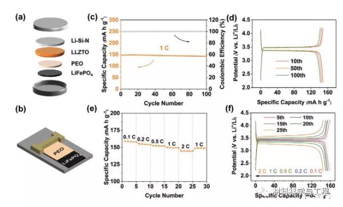 圖5.a,b)全固態Li-Si-N|LLZTO|PEO-LiFePO4電池的製備和組裝示意圖。