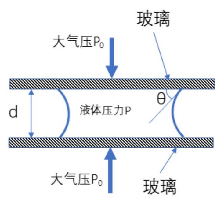 在兩片玻璃之間,形成的凹液麵就是因為這個接觸角的原因: