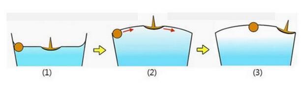 麥片圈效應中使得麥片相互吸引的因素是麥片之間的橫向毛細力(Lateral Capillary Force),橫向毛細力可分為吸引力和排斥力,這裏表現為吸引力。91视频网址软件通過一個簡單的例子,來說明一下橫向毛細力產生的原因。首先考慮單個小球放置在液麵上保持平衡,意即在重力的作用下對液麵形成一個擾動,此時若液麵上存在另外一個小球時,這種擾動會相互疊加,下圖中的液麵便是最終的擾動狀態。