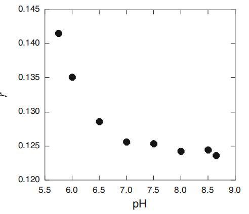 圖8:若丹明B在SLAS膠束(r)處的熒光各向異性與CS=25mM時pH的關係圖