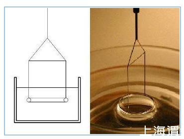 掛環法(Du Nouy Ring method):這可能是測量表麵/界麵張力的最經典方法,文獻上報道的許多液體的表/界麵張力值是用這一方法測得,它甚至可以在很難浸濕的情況下被使用。用一個初始浸在液體的環從液體中拉出一個液體膜(類似肥皂泡),同時測量提高環的高度時所需要施加的力。
