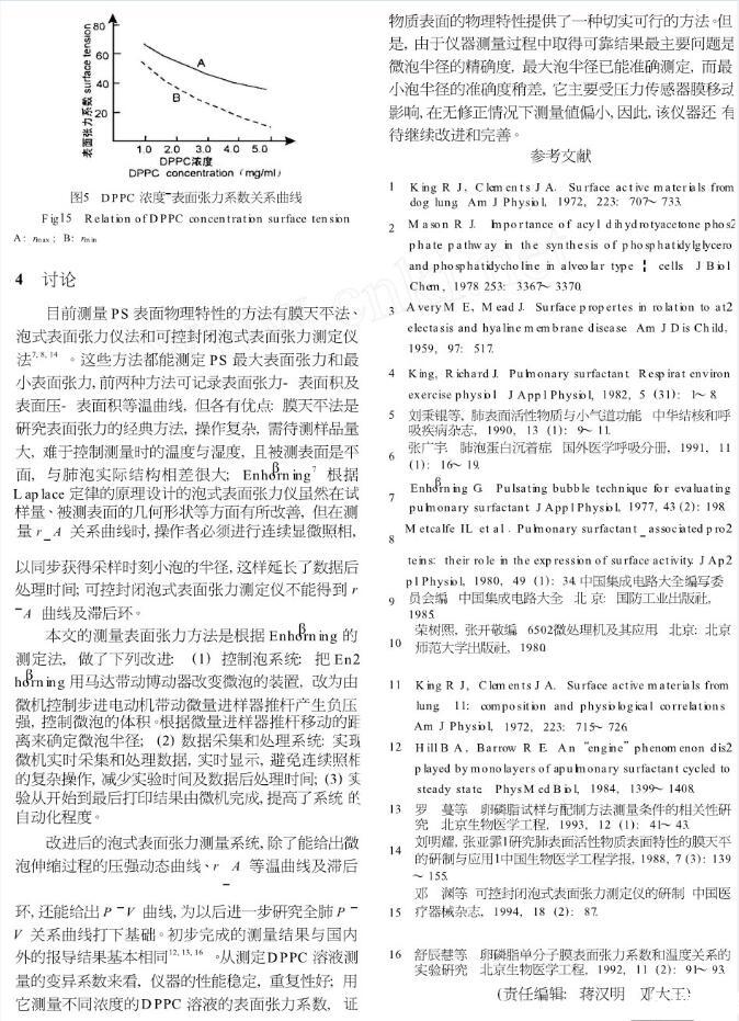 為了研究肺表麵活性物質表麵的物理特性,91视频网址软件改進Enhorning根據Laplace原理提出的泡式表麵張力測定技術,建立了微機控製泡式表麵張力檢測係統,使實驗周期短,操作簡單,所得結果與前人的結果相符。