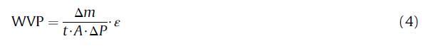 其中WVP=水蒸氣滲透率,單位g mm m-2次方h-1次方Pa-1次方;ε=厚度mm;m=質量隨時間的變化,單位為g;t=h中的時間;A=薄膜麵積,m2;和DP=杯內薄膜表麵的校正水蒸汽分壓e櫃內薄膜外表麵的水蒸汽分壓。