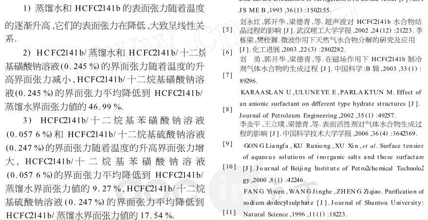【摘要】:表麵活性劑能夠減小液體的表麵張力以及兩相液體間的界麵張力,界麵張力的減小有利於促進氣體水合物快速形成和提高水合物儲氣能力.為定量研究兩相液體間界麵張力對氣體水合物形成的影響,用界麵張力儀實測不同溫度時蒸餾水、HCFC-141b的表麵張力以及HCFC-141b/蒸餾水、HCFC-141b/十二烷基硫酸鈉溶液(0.247%)、HCFC-141b/十二烷基磺酸鈉溶液(0.245%)、HCFC-141b/十二烷基苯磺酸鈉溶液(0.057 6%)的界麵張力,測試結果表明,表麵活性劑對降低兩相液體間界麵張力的作用十分明顯,其中十二烷基苯磺酸鈉溶液對降低界麵張力最為突出,降到HCFC-141b/蒸餾水界麵張力值的9%左右,為定量研究氣體水合物等優選表麵活性劑提供了科學的依據。