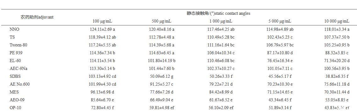 表3不同質量濃度的助劑溶液在小麥葉正麵上的靜態接觸角(mean±SD,n=5)