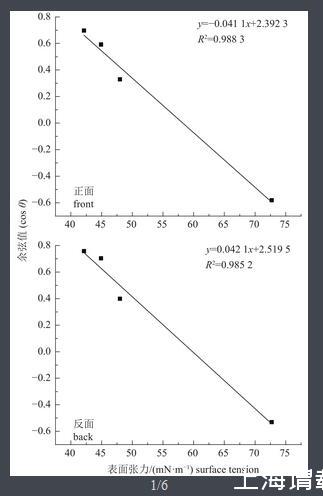 臨界表麵張力是固—液界麵化學中表征固體表麵能的一個重要指標,用以說明液體在固體表麵的可潤濕性。通過ZISMAN圖法[22]以接觸角的cosθ對液體表麵張力作圖得到接觸角與表麵張力的回歸直線如圖1所示:求得方程分別為y=−0.041 1 x+2.392 3和y=−0.042 1x+2.519 5。將圖中直線外延至cosθ=1處,得出小麥葉片正、反麵的臨界表麵張力值分別為33.88和36.08 mN/m,與顧中言等[21]研究結果幾乎一致。從測定結果可以看出:小麥葉片的反麵表麵張力值比正麵大,更容易被潤濕;但小麥葉片正、反麵的表麵張力估值較小,即表麵自由能較低,較難被潤濕。