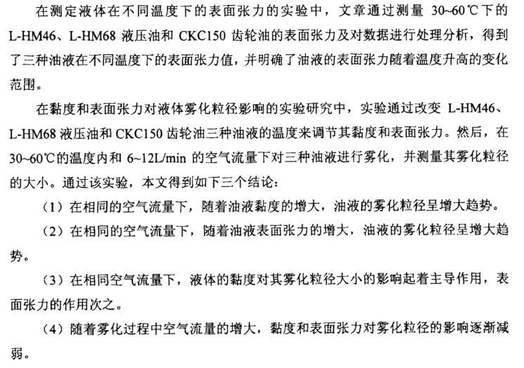 在黏度和表麵張力對液體霧化粒徑影響的實驗研究中,實驗通過改變L-HM46、 L-HM68液壓油和CKC150齒輪油三種油液的溫度來調節其黏度和表麵張力。然後,在30~60℃的溫度內和6~12L/min的空氣流量下對三種油液進行霧化,並測量其霧化粒徑的大小。通過該實驗,本文得到如下三個結論: