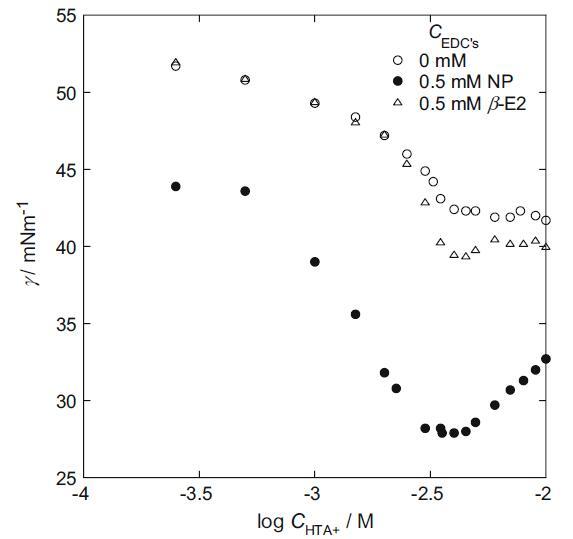 圖 2 存在各種內分泌幹擾物時的界麵張力 (γ) 與 log CHTA +/mol dm-3 的關係:5 mM hp-β-CD、0.49 M Na2SO4 和 0.01 M H2SO4