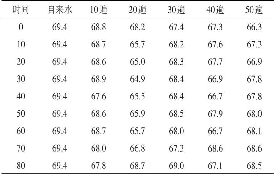 由圖表分析可知,自來水經過不同遍數處理後,其表麵張力值均有所下降。磁場強度為1.0 T時,下降幅度範圍為1.0~3.0 mN·m-1。處理50遍時,水的表麵張力減小的幅度約為3.1,相對於自來水的表麵張力減小了4.5%;當水被處理30遍到40遍時,水的表麵張力的下降速率出現明顯減緩的趨勢,水的表麵張力僅僅減小了0.1 mN·m-1,相對於水被處理20遍到30遍時表麵張力下降值的百分比為12.5%。